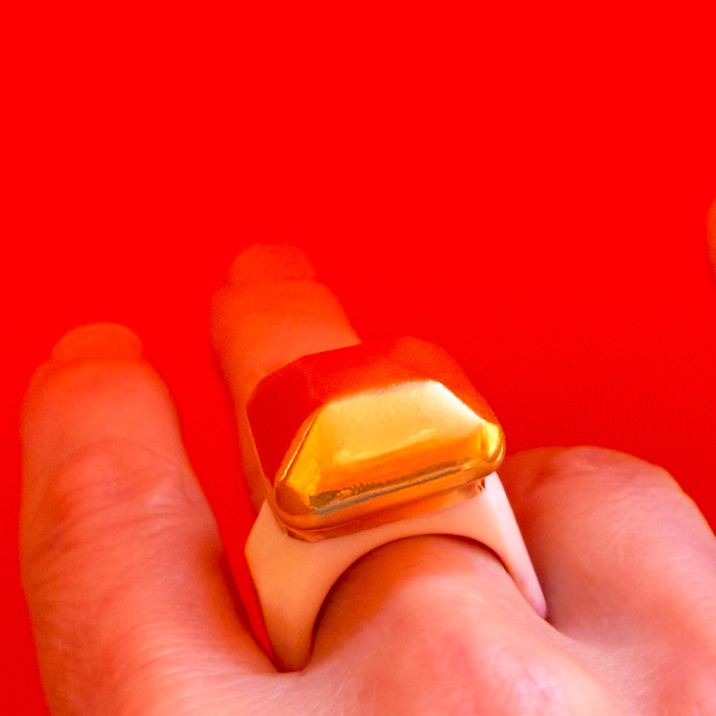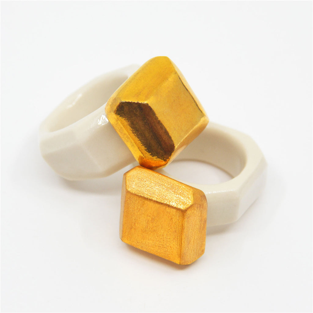 This one-of-a-kind ring is handcrafted and carved of porcelain, it is glazed in smooth and creamy white, with a striking shiny 22 karat gold glazed gem-shaped top adorning the ring.