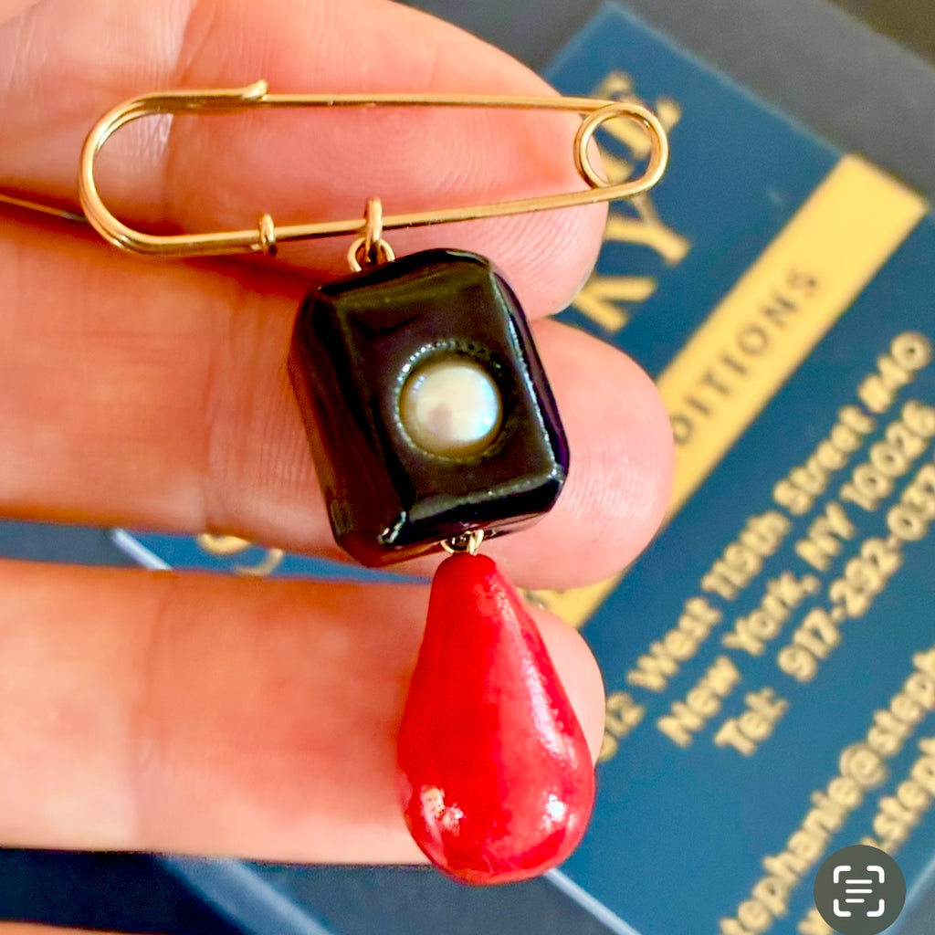 This one-of-a-kind pin pendant is handcrafted of porcelain. The black faceted cube shaped bead is adorned with a shiny white button pearl set in the center of the bead, the dangling drop shaped porcelain bead is glazed in deep fiery red.